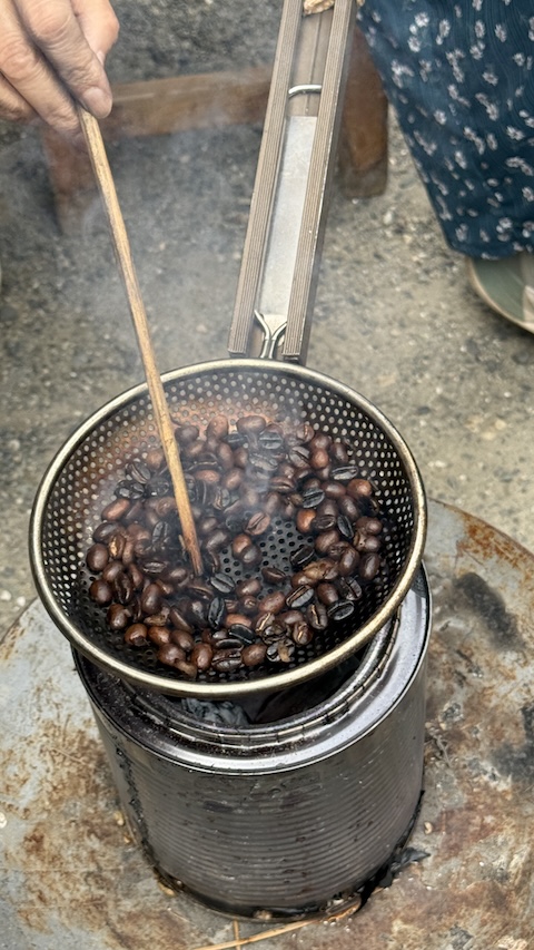 あとは、炭火を使って生のコーヒー豆を自分たちで煎って飲んでもらう